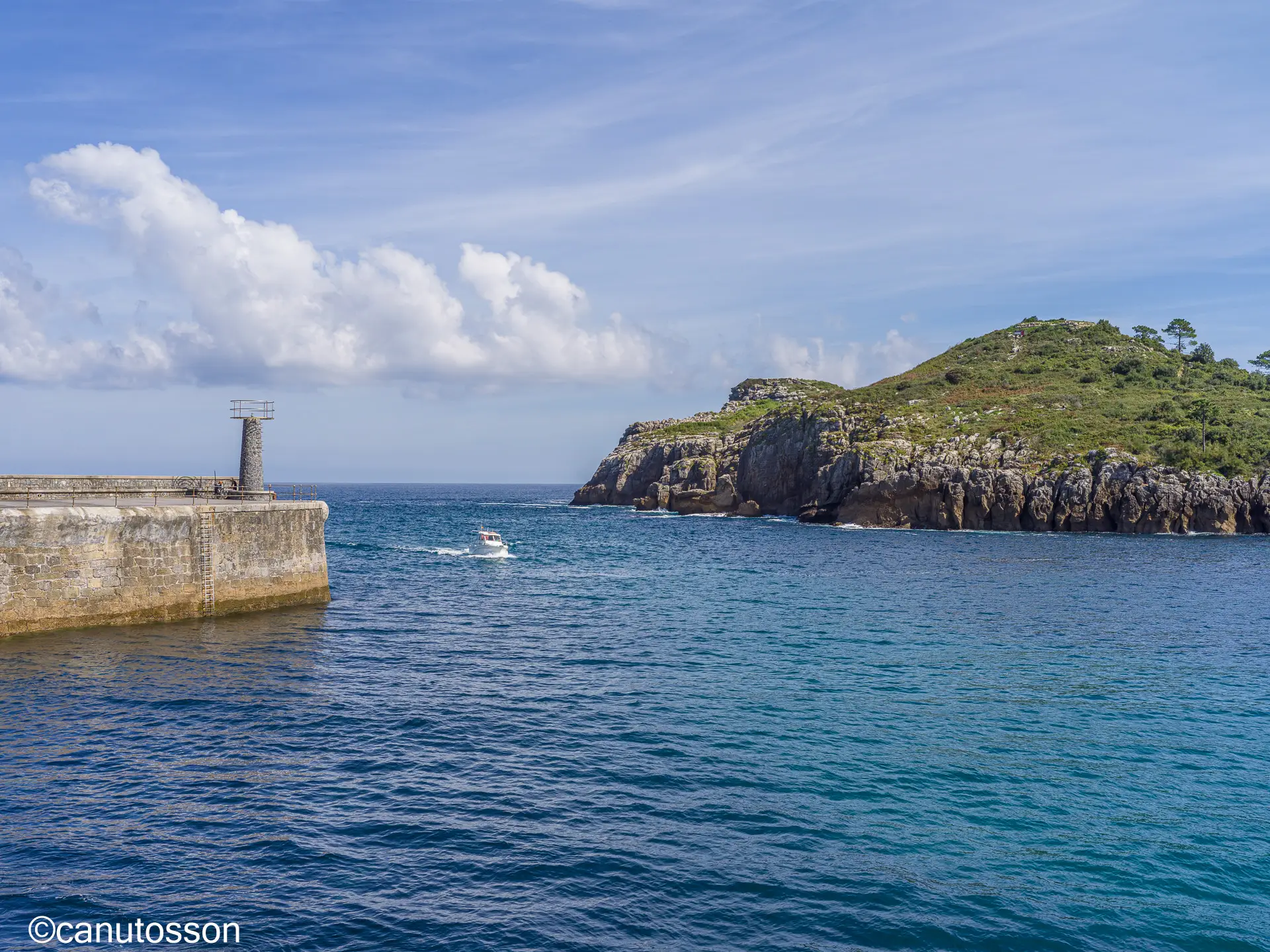 Espigón exterior construido en 1948 dada la gran actividad pesquera que todavía perduraba en esos años. En frente la isla de Garraitz a la que se puede llegar andando en días de marea muy baja.