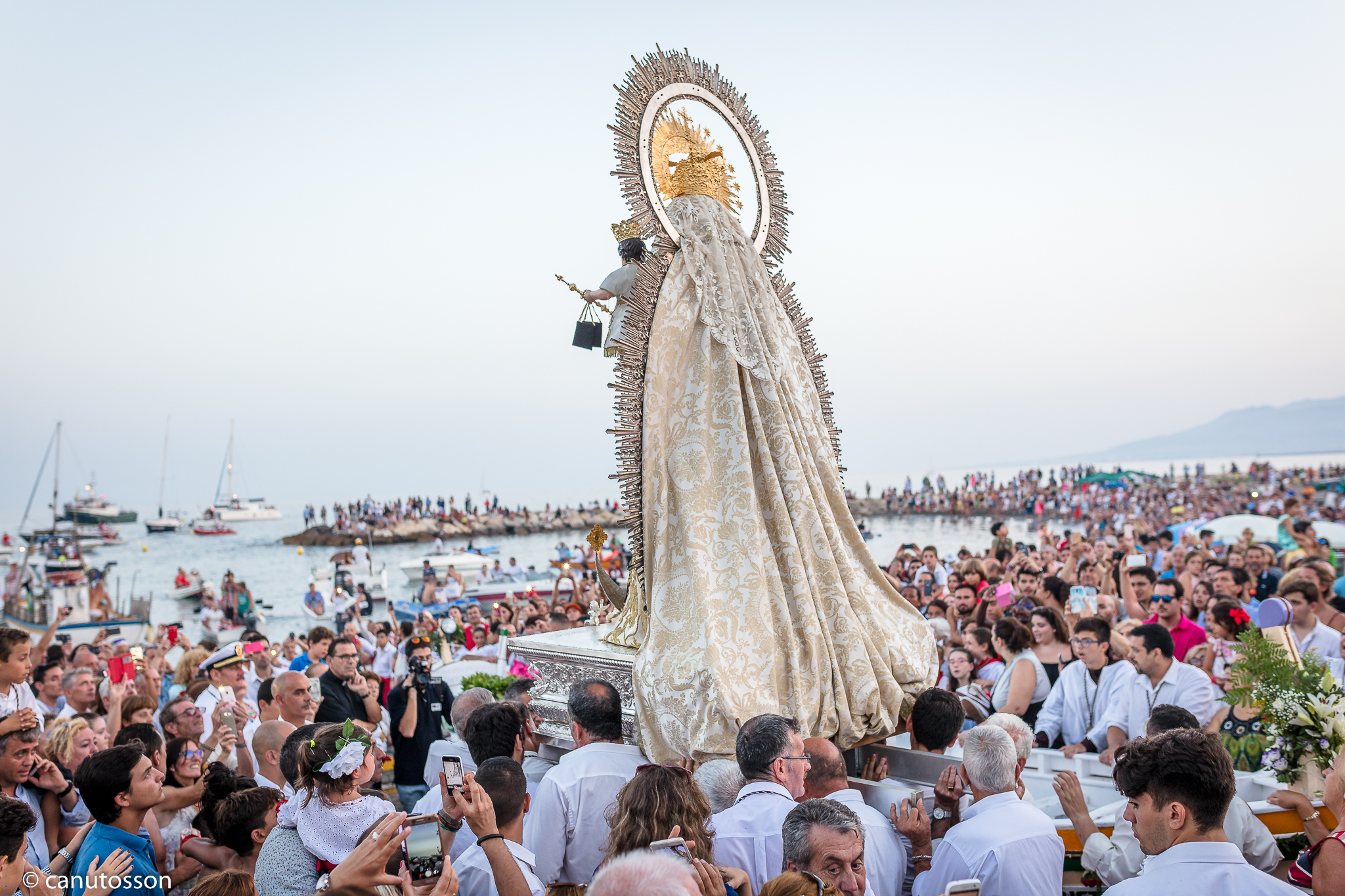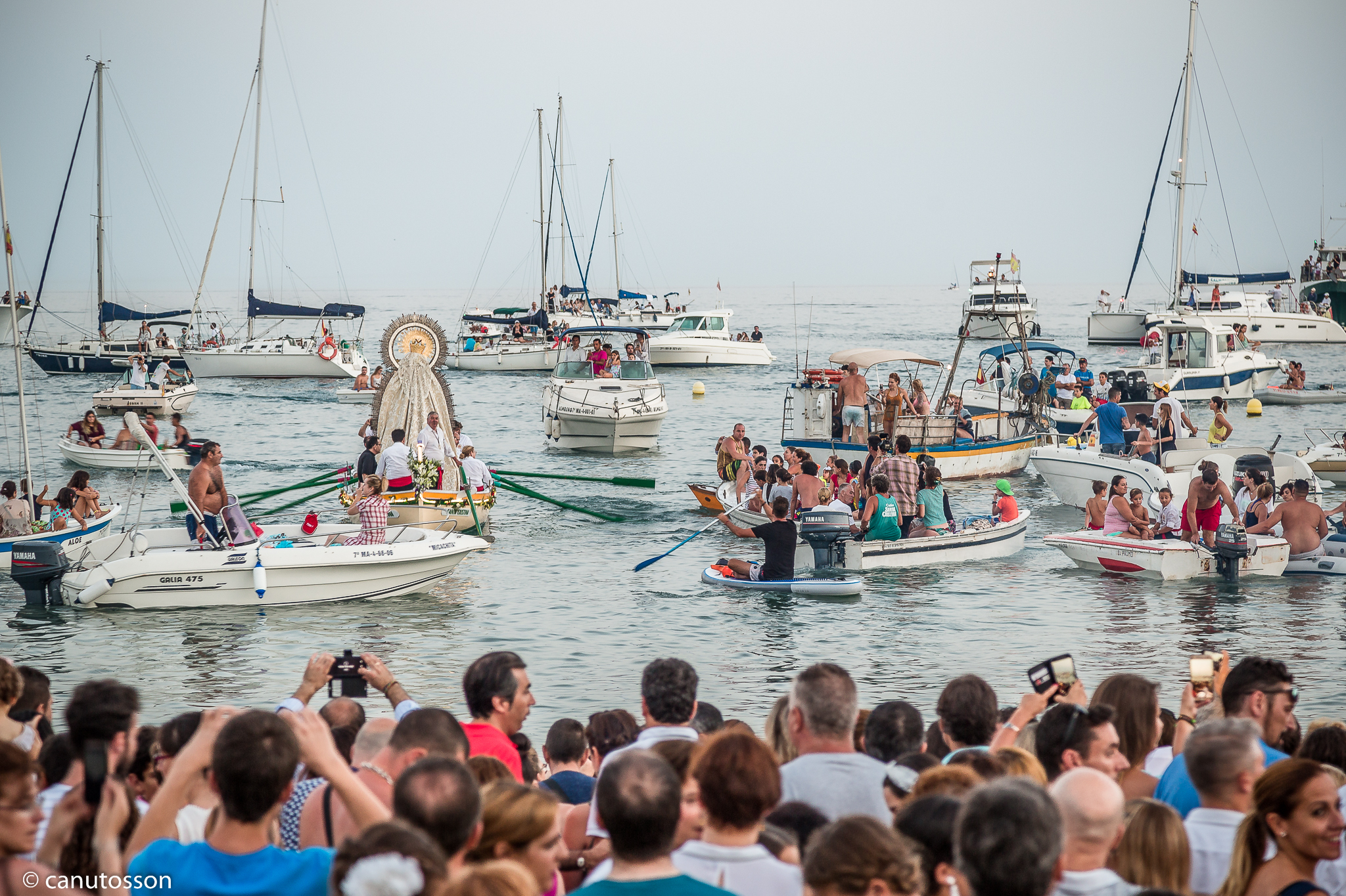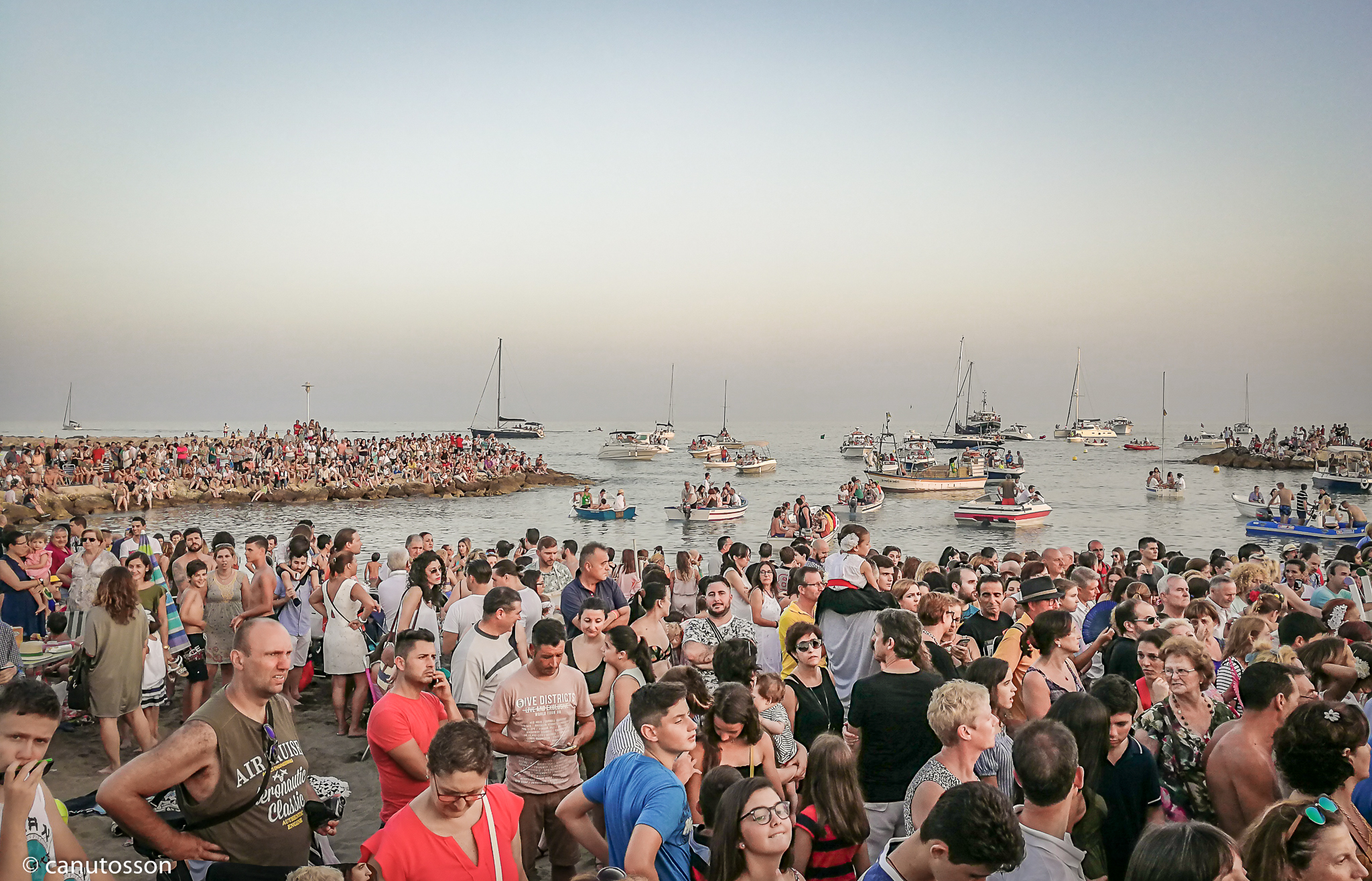 Cientos de personas, con más o menos muestras de fervor se agolpan en los aledaños en la que se botará la jábega con la talla de la Virgen. No faltan los vítores y muestras de fervor mariano, con ¡Vivas a la Virgen del Carmen! o aquellos que prefieren bañarse en el mar una vez atravesado éste por la jábega, introducir sus pies en el agua litoral seguros de que algún favor conseguirán de su querida Virgen o arrojan al mar en señal de pleitesía religiosa las siempre presentes biznagas de estas fechas.