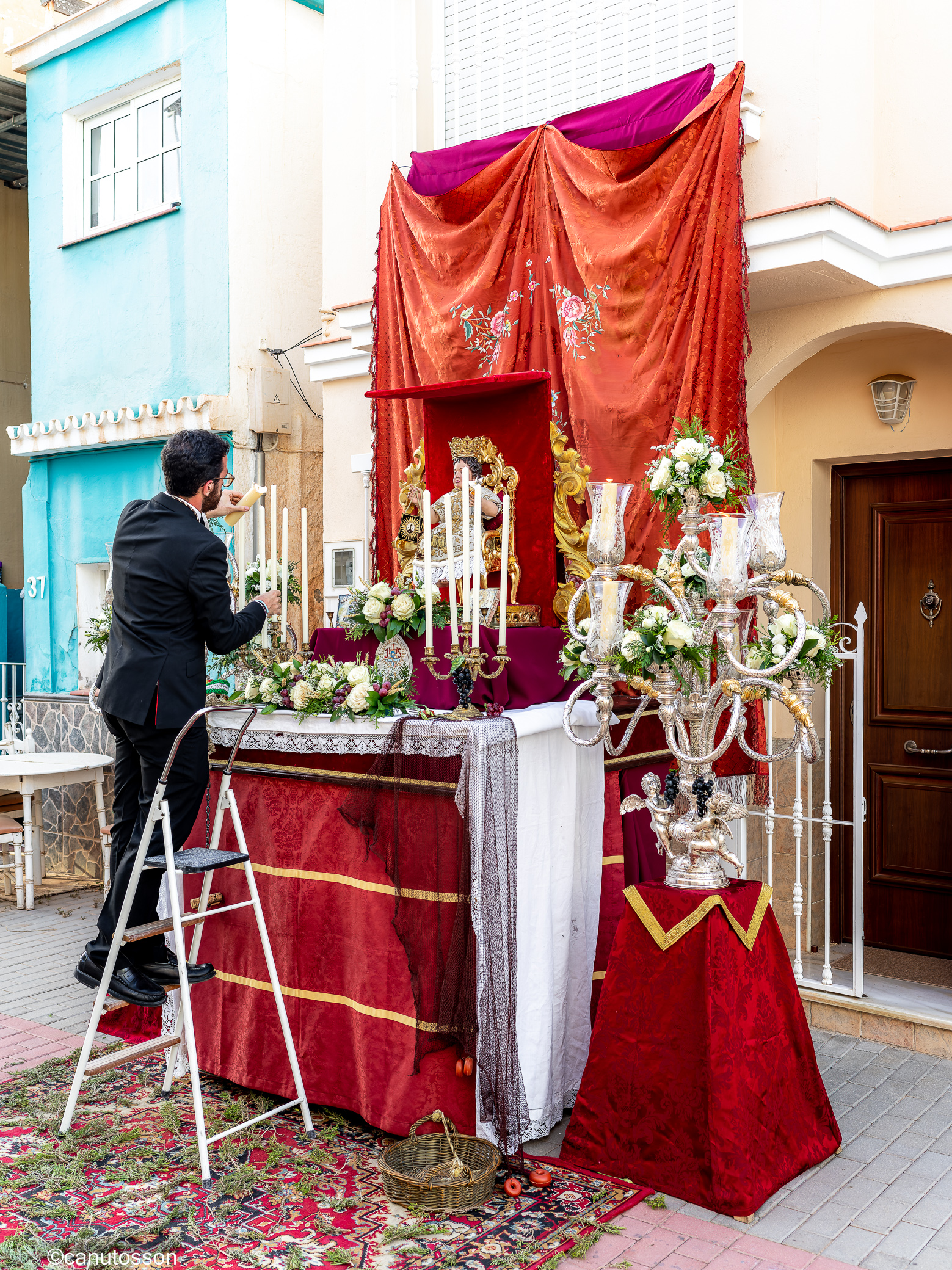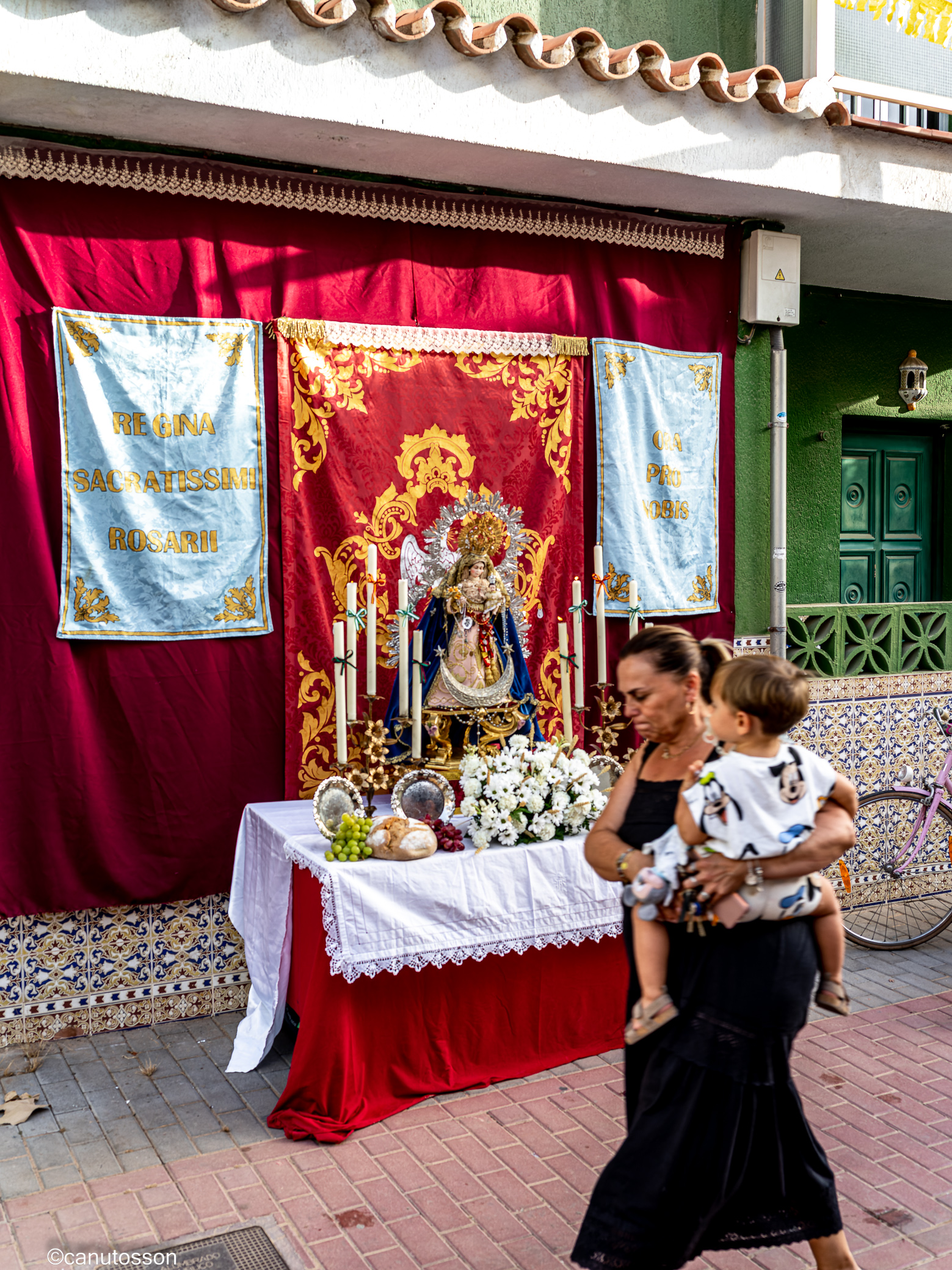 Entrando por la calle Boquerón a eso de las ocho de la tarde y en la esquina confluyente con la de Pepote descubrí sorprendido un montaje un tanto desconcertante e inusual. Alguien había colocado un monumental altar con imaginería cristiana engalanando una hermosa talla de una Virgen que según su propietario me manifestó ser la Reina de Todos los Santos.