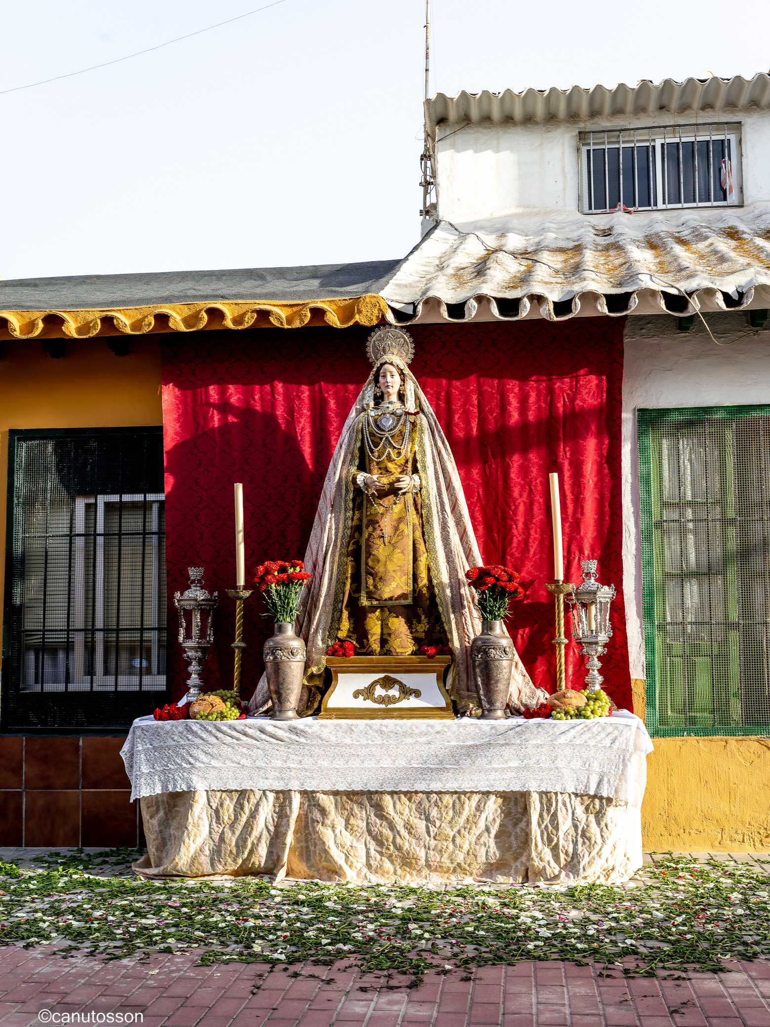 Descubrí al girar la vista hacia la izquierda en dirección longitudinal que la calle Pepote había sido también ornamentada con varios altares con sus respectivas Vírgenes.