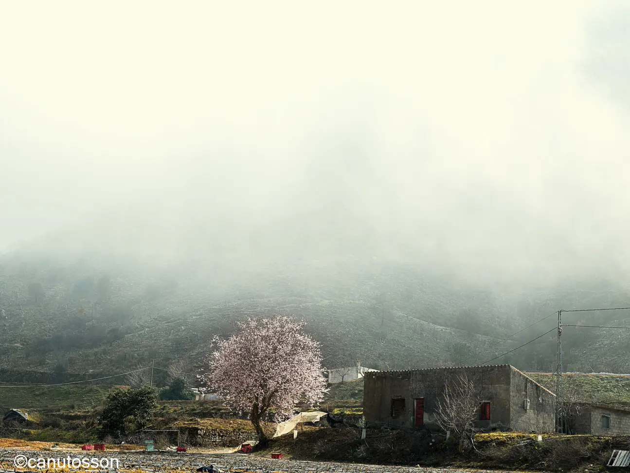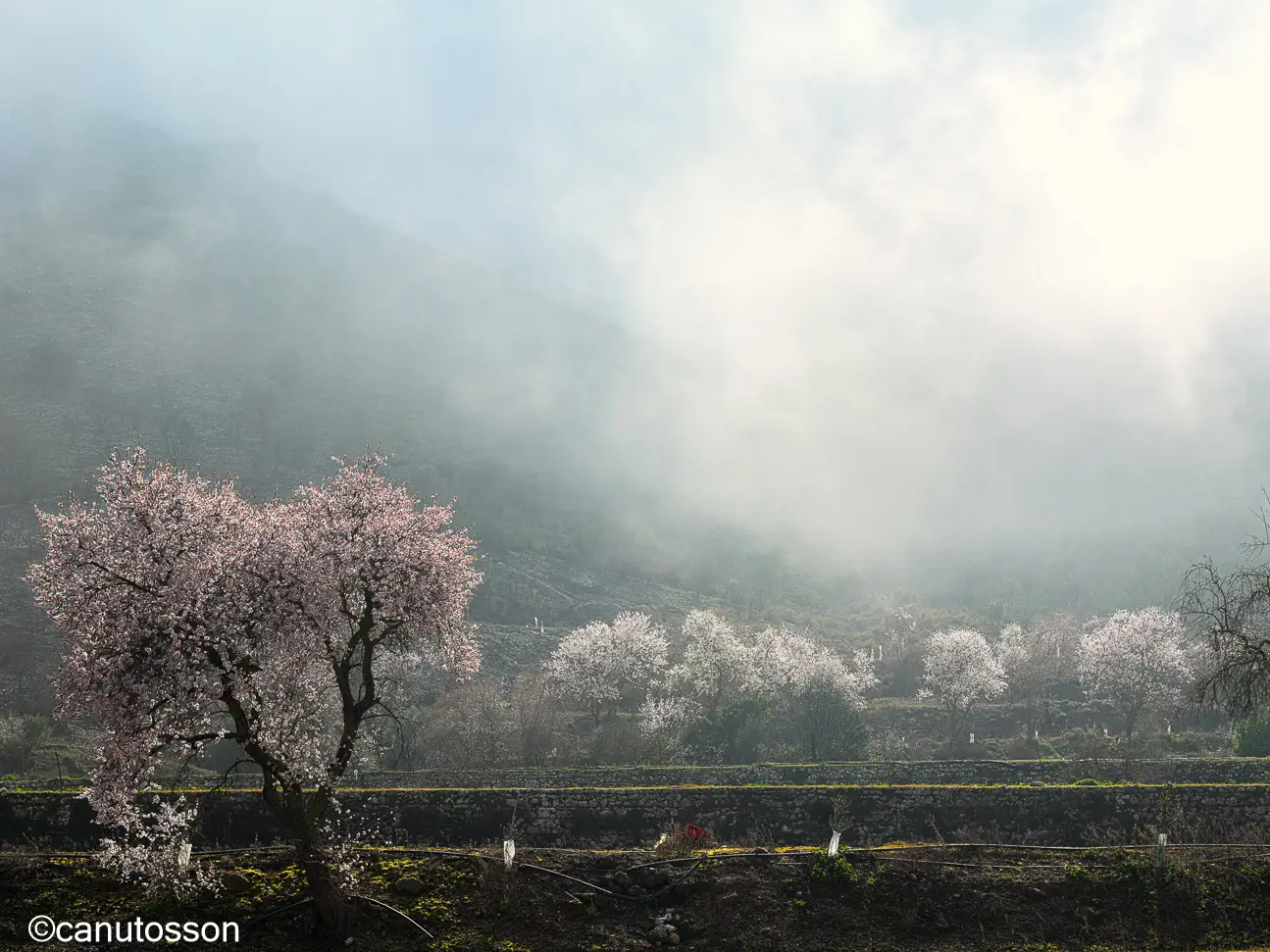 La niebla envuelve en una majestuosa levedad los almendros anunciando la llegada de la primavera.