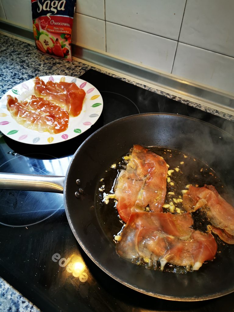 - Antes de que el ajo se dore fríe las lonchas de jamón rápidamente.