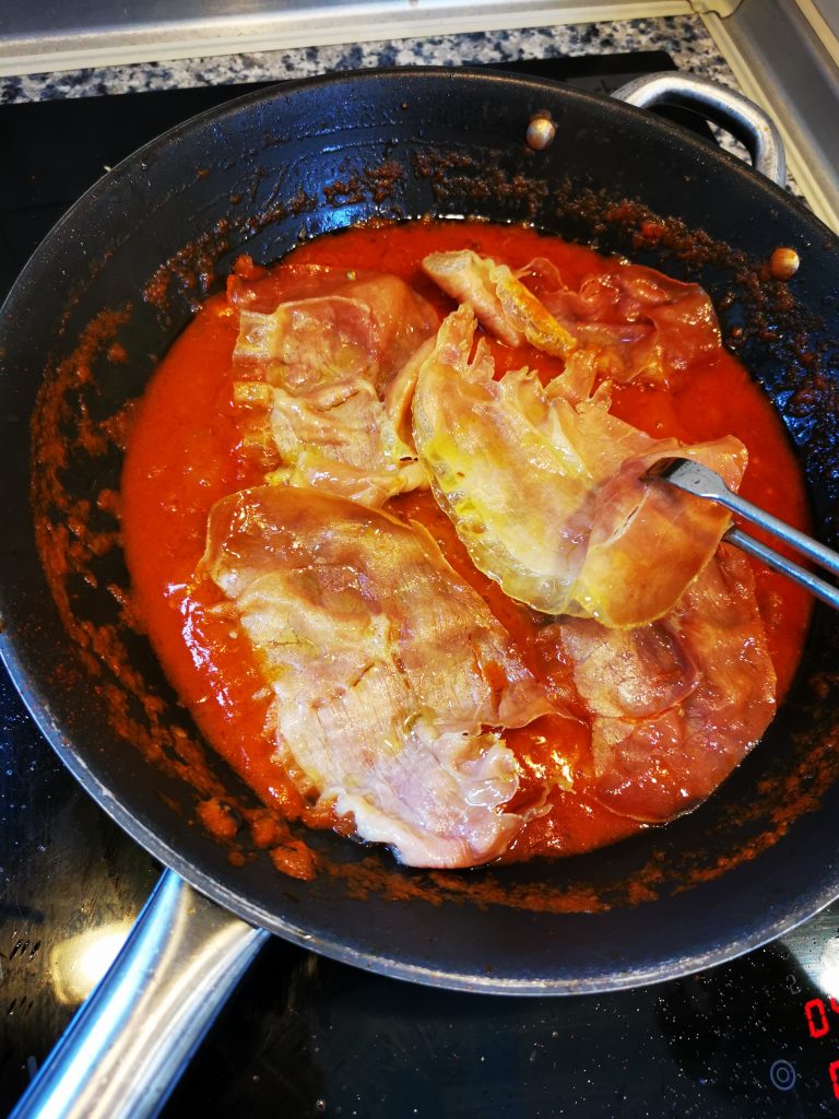 - Coloca las lonchas de jamón encima del tomate para que recuperen el calor perdido.