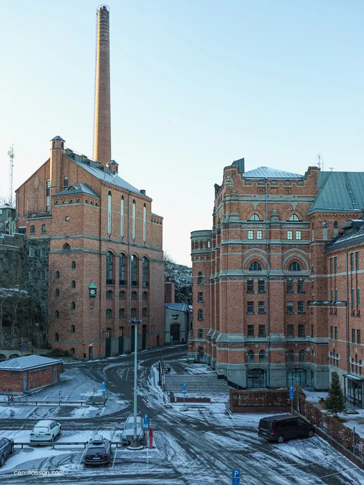 Antigua fábrica de cerveza Múnich de Estocolmo (1857). Arquitectura industrial sueca de ladrillo rojo visto, en estilo neogótico y romántico